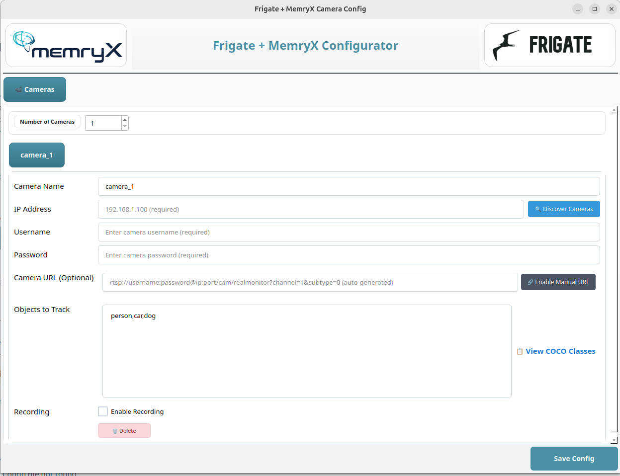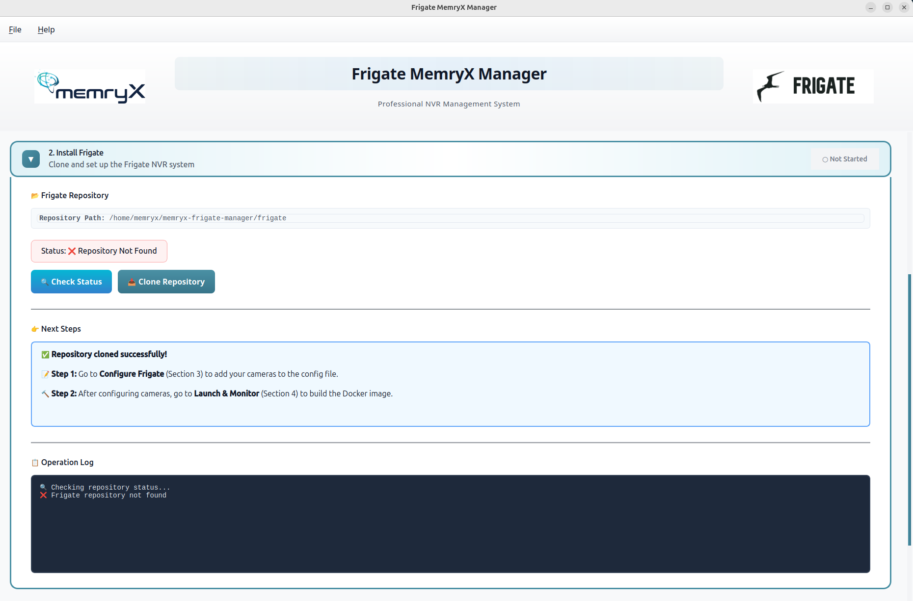If you already have a Frigate repository you’d like to use, you can place it inside thememryx-frigate-manager/folder and the GUI will pick it up.