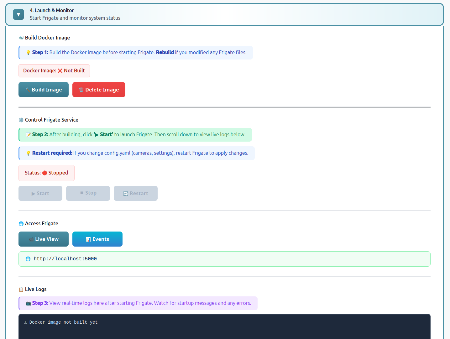 Once the image is ready, click Start Frigate and watch the logs to confirm everything is running properly.